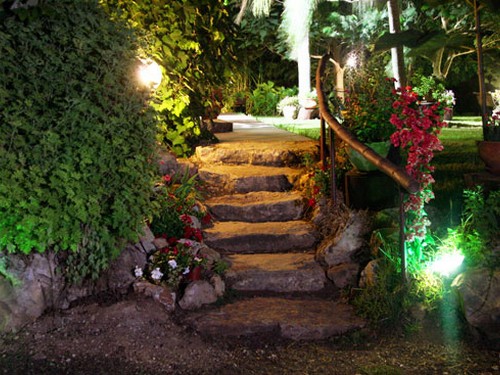 סביב הבקתות צמחייה פראית ושביל אבנים המוביל לבקתה עם תאורה רומנטית בלילה.