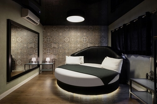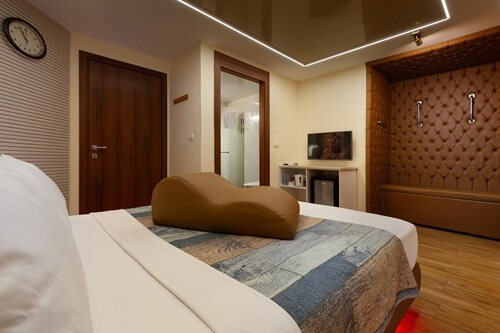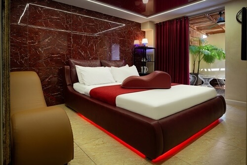 סוויטה 105 – סוויטה רומנטית לוהטת במיוחד עם אמבט מרווח, ג'קוזי אדום בצורת לב, מיטת עור עגולה באדום עז וכורסת טנטרה מטריפת חושים.